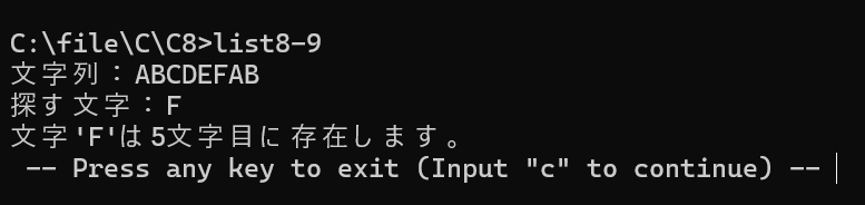 printf("文字'%c'は%d文字目に存在します。\n",ch,idx);