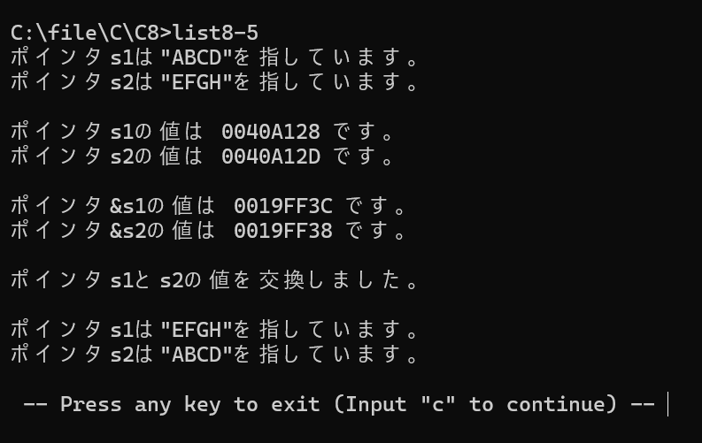 puts("\nポインタs1とs2の値を交換しました。\n");