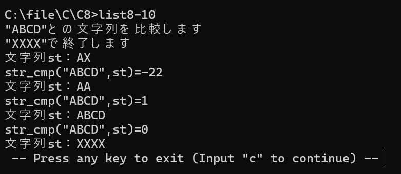 printf("str_cmp(\"ABCD\",st)=%d\n",str_cmp("ABCD",st));