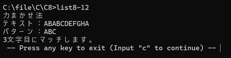 - アルゴリズムの基礎「力まかせ法」 List 8-12で学んだ探索ロジックは、すべてのアルゴリズムの原点です。「不一致なら一歩戻ってやり直す」という仕組みを理解することで、より高度なBM法やKMP法への道が開けます。